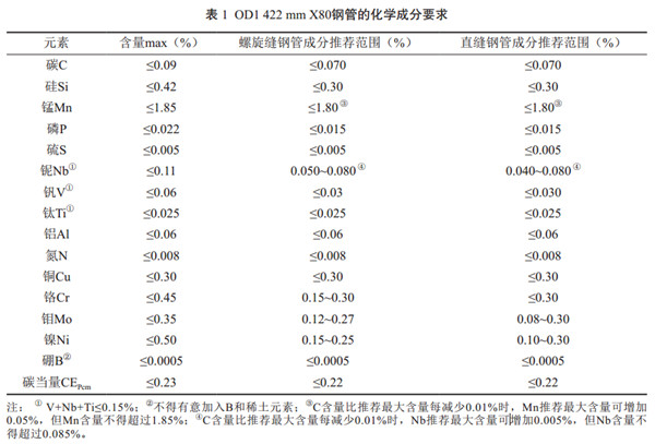 1 OD1 422 mm X80管線(xiàn)鋼管關(guān)鍵技術(shù)指標