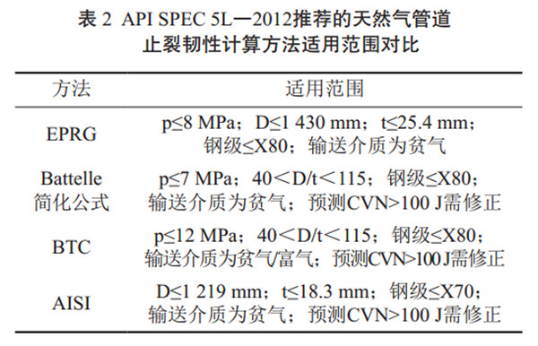 API SPEC 5L―2012《管線(xiàn)鋼管規范》推薦了4種鋼管延性斷裂止裂韌性的計算方法,包括EPRG準則、 Battelle簡(jiǎn)化公式、 BTC方法以及AISI方法。對比4種方法的適用范圍(表 2)可見(jiàn),對于設計壓力12 MPa、管徑1 422 mm X80的天然氣管道,適宜采用BTC模型并引入修正系數的方法來(lái)計算止裂韌性。