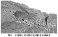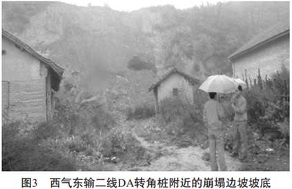 圖4為西氣東輸管道3232km+700m里程處的邊坡坍滑體, 管道沿60~70m高的山坡鋪設, 埋深2.4m, 回填土為當地的黃土狀土, 土質(zhì)松散,雨水浸泡后產(chǎn)生坍滑, 將坡腳擋墻擠毀并越頂堆積于前緣, 致使管道外露并形成危害。