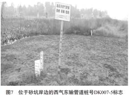人為活動(dòng)主要是指亂采、 亂挖, 灌溉水下滲、 爆破震動(dòng)等, 對管道安全造成危害。 圖7、 圖8為采砂挖砂后形成的地下水匯聚湖塘, 岸邊距管線(xiàn)近10m, 采砂活動(dòng)一直在進(jìn)行, 岸邊的漸進(jìn)坍塌對管線(xiàn)存在隱患。