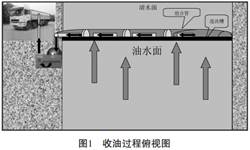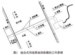 2. 油水分離和油品回收, 當外泄油品被架設在河水面上的管件攔住后, 隨著(zhù)上游浮油順水不斷下流, 欄管前的油位不斷增高, 由于攔管上開(kāi)設的進(jìn)油槽下沿僅高于水面3—5mm, 當油位高于水面3—5mm時(shí), 浮油就會(huì )自然流進(jìn)進(jìn)油槽, 達到了“攔水放油”和油水分離的效果, 油經(jīng)攔油管流至回收器儲油箱, 啟泵可將油外輸回收。