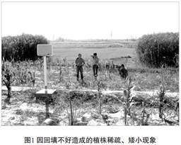 甘州區堿灘鄉三壩村一社管道穿越農田上方的土壤剖面顯示, 地表20cm以下出現石粒、 砂粒和粘土的混合層, 此層硬實(shí)度較高, 鐵鍬難以下挖; 而在非管道上方的土壤剖面顯示, 地表以下0-40cm內沒(méi)有發(fā)現砂石粒層。 這種情況表明油氣管道施工埋管時(shí)沒(méi)嚴格按照回填順序操作, 將較深層的砂石粘土混合物填在了耕作層中, 限制了玉米根系的生長(cháng)。 玉米的根系一般分布在0-40cm左右的土層中, 根系的生長(cháng)受到限制會(huì )影響根系的生長(cháng)發(fā)育, 進(jìn)而制約水分和養分的吸收。 植物得不到足夠的水分和養分, 生長(cháng)發(fā)育受到影響,就表現出我們所見(jiàn)到的植株低矮、 稀疏、 發(fā)育滯后等現象(圖1) , 造成作物減產(chǎn)。
