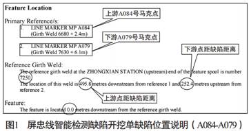 筆者以2008年8月的屏忠線(xiàn)檢測數據生成的一張缺陷開(kāi)挖單舉例做簡(jiǎn)單說(shuō)明。 見(jiàn)圖1, 上游A084號馬克點(diǎn)在6680號環(huán)焊縫下游2.4米處, 下游A079號馬克點(diǎn)在7630號環(huán)焊縫下游6.1米處, 兩點(diǎn)間距為748.2米(495.8米+252.4米) , 上游點(diǎn)距離缺陷點(diǎn)較近的7250焊口495.8米, 下有點(diǎn)距離缺陷點(diǎn)較近的7250焊口252.4米。 那我們使用皮尺從下游點(diǎn)往上游點(diǎn)測量前進(jìn)252.4米, 就是7250焊縫位置, Feature中的“0.0metres”表示缺陷與7250焊縫的距離是0米, 這說(shuō)明缺陷就在焊縫上。