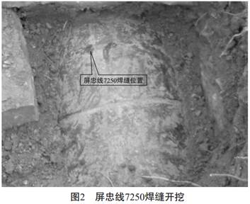 完成7250位置測量后, 垂直于水平面進(jìn)行開(kāi)挖, 如圖2, 發(fā)現焊縫。