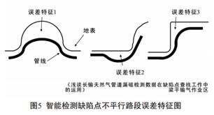 因為地面高低起伏不是規則的幾何圖形, 不是絕對的矩形或絕對的圓, 所以要通過(guò)精確計算是很有難度的, 通,F場(chǎng)測量對誤差的把握靠的是現場(chǎng)測量人員的經(jīng)驗和判斷。 整個(gè)測量過(guò)程必須應用探管儀對管道埋深進(jìn)行全程監控, 遇見(jiàn)如圖5中的誤差特征或其他特征時(shí), 測量人員應合理運用幾何知識對測量誤差進(jìn)行加減修正。 如果現場(chǎng)計算判斷失誤量累計過(guò)多, 誤差就會(huì )超出控制范圍。