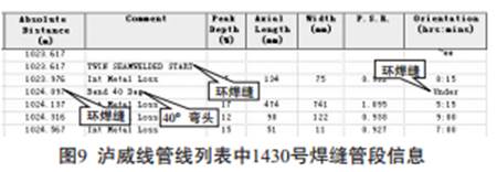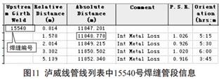 但還有更簡(jiǎn)單的方法。 同樣以圖8所示缺陷為例, 通過(guò)PII橫向功能列表里面中的“ Pipeline”按鍵可打開(kāi)管線(xiàn)列表(注: 管線(xiàn)列表主要記錄了每段管節的長(cháng)度, 焊縫里程、 彎頭度數等信息) 。