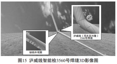 如圖15, 我們通過(guò)該管道的3D影像明顯的看到了焊縫3560處的彎頭。 經(jīng)驗豐富、 對管道現場(chǎng)熟悉的管護工可以不進(jìn)行任何測量就直接找到位于山坡上的彎頭。 找到鏈接彎頭的3560號焊縫后, 結合圖14, 從焊縫朝上游準確測量焊縫0.377米(9.13-8.753) 就是缺陷點(diǎn)。