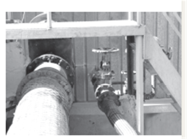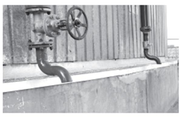 (3)在消防管線(xiàn)立管末端上安裝一個(gè)彎頭, 使消防管線(xiàn)內的水排放在散水外邊,防止水溢流在罐體散水上,確保散水水泥板的完好(圖8)。