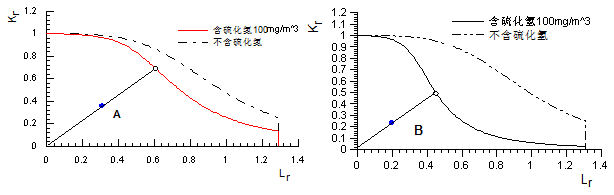 圖2為X60管道完整性評價(jià)曲線(xiàn),缺陷評價(jià)點(diǎn)A的坐標為(0.3205,0.3763),對應的安全系數為1.7367,從圖中可看出,含硫化氫管道評價(jià)曲線(xiàn)安全區域范圍變小。圖3為X65鋼管道完整性評價(jià)曲線(xiàn),缺陷評價(jià)點(diǎn)A的坐標為(0.2038,0.2650),對應的安全系數為1.8375,從圖中也可看出,含硫化氫管道評價(jià)曲線(xiàn)安全區域范圍變小。