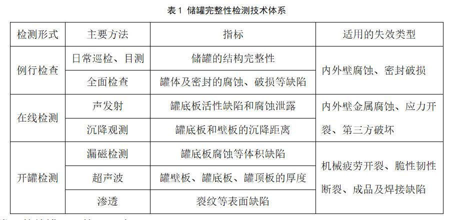 儲罐完整性評價(jià)包括三個(gè)方面,即完整性檢測、剩余壽命預測和沉降變形評估。檢測技術(shù)是完整性評價(jià)的關(guān)鍵。儲罐的完整性檢測包括日常巡檢、全面檢查、技術(shù)性檢測和開(kāi)罐檢測四個(gè)方面(見(jiàn)表1)。日常巡檢和全面檢查主要是通過(guò)視覺(jué)觀(guān)察的方法,檢查是否有損壞的罐體結構;技術(shù)性檢測是在不停產(chǎn)的情況下進(jìn)行的在線(xiàn)檢測,檢測技術(shù)主要有聲發(fā)射檢測、沉降觀(guān)測等;開(kāi)罐檢測技術(shù)有漏磁檢測、超聲波、射線(xiàn)、磁粉和滲透等[1]。