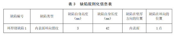 為評價(jià)缺陷嚴重程度,依據API579-2007《服役適用性評價(jià)》進(jìn)行了安全評價(jià),保守起見(jiàn),將未熔合缺陷等效為裂紋型缺陷進(jìn)行評價(jià),將缺陷信息規則化如表3。