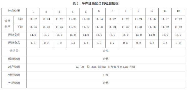 在開(kāi)挖抽查檢測中另發(fā)現一處位于非高后果區管段的環(huán)焊縫缺陷,超聲檢測評價(jià)為Ⅳ級,射線(xiàn)檢測評價(jià)為Ⅰ級,磁粉檢測評價(jià)和外觀(guān)檢查合格。按照分級標準,此環(huán)焊縫超聲檢測不合格。此處管道公稱(chēng)壁厚為11.4mm,實(shí)測平均壁厚為11.19 mm,未見(jiàn)明顯減薄。詳細檢測數據見(jiàn)表5。