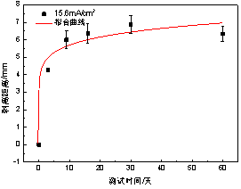 根據建立的陰極剝離預期壽命模型,可以獲得不同電流密度下防腐層剝離距離達到一定值時(shí)的壽命特征(即時(shí)間),在實(shí)際海管陰極保護設計時(shí),可參考此方法,以高電流密度下的壽命特征外推獲得低電流密度下的壽命特征。