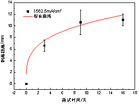 (1)同樣的電流密度下,隨著(zhù)時(shí)間的增加,陰極剝離距離逐漸增加,且在實(shí)驗前期增加速度較快,在實(shí)驗后期增加速度變緩;同樣的實(shí)驗時(shí)間下,施加的電流密度越高,陰極剝離距離越大;