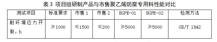 該防腐料已實(shí)現工業(yè)化生產(chǎn)和鋼管涂覆應用,累計生產(chǎn) 3000 余噸,成功應用于柴北緣項目等管徑457毫米油氣管線(xiàn),效果良好。其中 BSG-PE01、BSG-PE02 兩個(gè)牌號的產(chǎn)品還通過(guò)了中石油集團公司新產(chǎn)品認定,并列入了自主創(chuàng )新重要產(chǎn)品目錄。