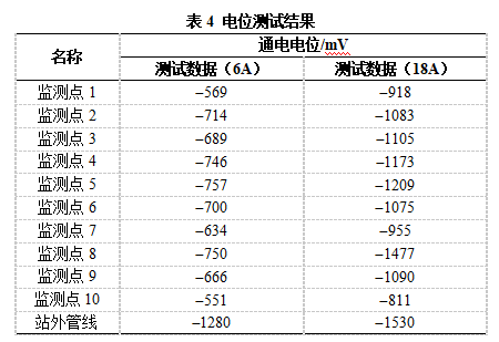 由表2 、3可知,斷電電位有時(shí)比通電電位高,是由于陽(yáng)極位置分布造成的,同時(shí)站內外的斷電電位都沒(méi)達到-850mV的最低保護電位要求。當站外管道電位為-850mV時(shí),站內管道都沒(méi)達到陰極保護準則要求。為了進(jìn)一步驗證干擾程度的大小,將站內管線(xiàn)電位提高(電流從6A增加到18A),測試站內外管道電位變化,結果見(jiàn)表4。