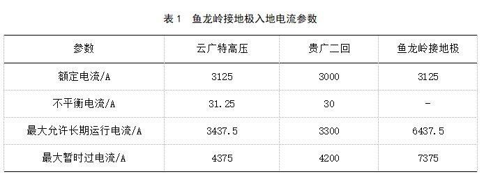 直流輸電系統可以采用雙極和單極兩種運行方式。在雙極運行方式中, 利用正負兩極導線(xiàn)和兩端換流站的正負極相連, 構成直流側的閉環(huán)回路。在雙極對稱(chēng)運行時(shí),接地極入地電流在額定電流的1%以?xún);當雙極不對稱(chēng)運行時(shí), 流過(guò)接地極的電流為兩級運行電流之差。在單極大地返回運行方式中, 流過(guò)接地極的電流即為直流輸電運行電流。以魚(yú)龍嶺接地極為例,其入地電流見(jiàn)表1。