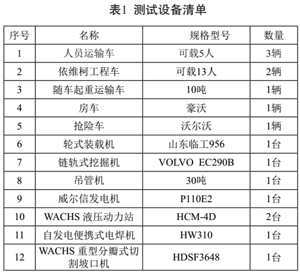 果子溝通道于2009年10月建成,西二線(xiàn)于2009 年底投產(chǎn),西三線(xiàn)于 2014年底投產(chǎn),總長(cháng)約32公里。為弄清一旦發(fā)生管道泄漏、破裂事故,尤其是大雪封山季節,能否快速準確到達事發(fā)地點(diǎn),及時(shí)展開(kāi)設備維搶修,達到最高效率、最低成本、最小風(fēng)險等效果,西部管道公司獨山子輸油氣分公司于2015年12月30日進(jìn)行了果子溝2#聯(lián)絡(luò )線(xiàn)至4B隧道段的測試。測試設備清單見(jiàn)表1。
