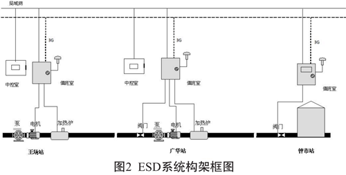 在每個(gè)輸油泵站安裝PLC自動(dòng)控制器,調控中心安裝控制站和緊急停輸按鈕,既可以由系統自動(dòng)停輸,也可由調度監控人員實(shí)現遠程緊急停輸控制。系統構架框圖見(jiàn)圖2。