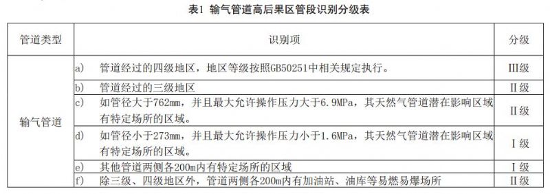 規范中規定的輸氣管道高后果區識別管段分級見(jiàn)表1。