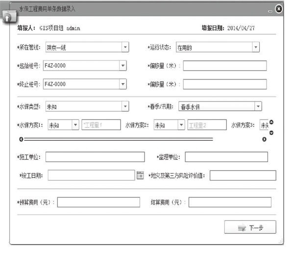1) 在線(xiàn)單條數據錄入是由用戶(hù)在GIS系統中填寫(xiě)所屬管線(xiàn)、起止樁號、預算費用和結算費用等信息審核后上傳至系統中。