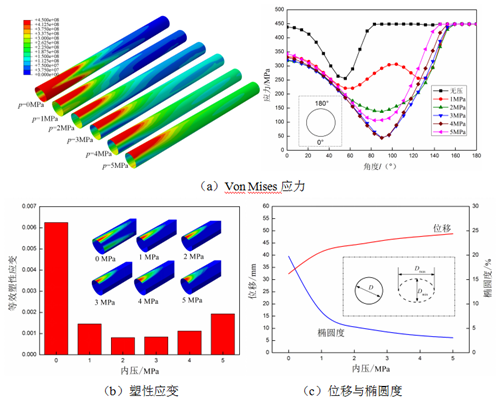 圖3(b)中,隨著(zhù)內壓增大,管道最大等效塑性應變先減小后增大,無(wú)壓管道的塑性應變最大,塑性變形區主要出現在管道頂部,管道下半部分未發(fā)生塑性變形,無(wú)壓管道的兩側也發(fā)生了塑性變形。隨著(zhù)內壓的增大,橢圓形塑性區的長(cháng)半軸逐漸減小,而短半軸則逐漸增大。