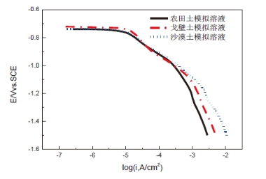 根據表1分析三種土壤模擬溶液的離子成分與理化性質(zhì),沙漠、戈壁和農田土壤的離子含量依次升高,農田土壤模擬溶液中的離子含量最高, 電導率為5040μs/cm;戈壁土壤模擬溶液中的離子含量次之,電導率為815μs/cm;沙漠土壤模擬溶液中的離子含量最低,電導率為364μs/cm。同時(shí),三種土壤模擬溶液中的pH值也依次增加,兩種因素均導致同樣的電位下陰極析氫電流密度依次增加。