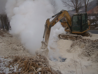 管道上方土壤受硫酸污染,中和反應時(shí)傾倒了大量生石灰。反應結束后,人工清理污染物對人員健康危害極大且不易進(jìn)行。由于生石灰在攪拌過(guò)程中放出大量熱量,管道上方土壤有熱氣冒出,凍土松軟,用管道定位測深儀器反復精確定位和測深,測得該處管頂埋深為0.9—1.2 m;為防止誤傷防腐層用圓頭鋼筋進(jìn)行密集扦插確定安全挖掘深度,插入深度為0.60 m。據此,采用小型挖掘機對表層進(jìn)行了清理,清理深度控制在0.3—0.4 m之間,見(jiàn)到原土層后采用人工清理。污染土壤運至化工廠(chǎng)進(jìn)行消解。