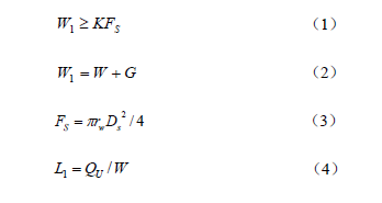式中:W1為管道抗浮力,N/m;L1為由浮力控制安裝間距,m;Qu為每套螺旋地錨的設計拉力, N;G為單位長(cháng)度管身自重,N/m;W為單位長(cháng)度配重,N/m; Fs為單位長(cháng)度管段靜水浮力,N/m; rw為所穿水域水的重度,N/ m3; Ds為管身結構的外徑,m;K1為穩定安全系數,取1.2。