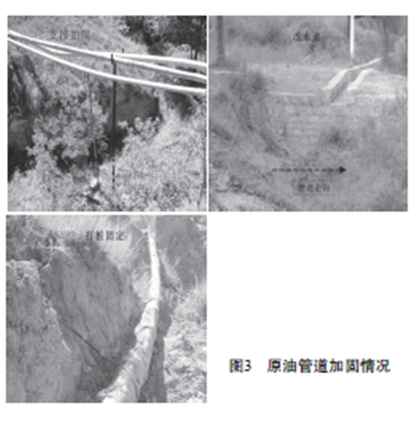 對管道實(shí)施加固工程。懸空超過(guò)10米以上的管道,重新添加管線(xiàn)支撐48處;支墩下移已起不到支撐作用的,現場(chǎng)重新制作管道支墩26座;管道容易出現塌方的部位,改水道、修排水渠6處;已經(jīng)處于塌方地段的管道,無(wú)法改水渠和進(jìn)行加固時(shí),現場(chǎng)打樁用鋼絲繩進(jìn)行固定36處,盡可能使其不受山體塌方的影響(如圖3所示)。
