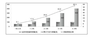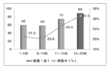 通過(guò)對使用20年以?xún)鹊挠凸艿肋M(jìn)行統計分 析,發(fā)現隨著(zhù)使用時(shí)間的延長(cháng)腐蝕穿孔幾率增 加,特別是運行10年以上的管道發(fā)生腐蝕穿孔的 概率呈上升趨勢。但管道腐蝕穿孔與年限無(wú)絕對 關(guān)系。通過(guò)對采出水鋼管道泄漏次數與年限關(guān)系 數據進(jìn)行分析,得出回注采出水2年后的管道泄漏 次數上升明顯, 占17.5%;回注5 年后有60.5%的 管道發(fā)生過(guò)腐蝕 泄漏現象。