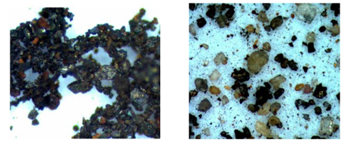 取少量樣品,用磁鐵吸引,大多數顆粒被吸引,主要為不透明的金屬物質(zhì),見(jiàn)圖2(左),以及少量無(wú)磁性的殘余顆粒,主要為透明的淺黃色、無(wú)色物質(zhì),見(jiàn)圖2(右)。