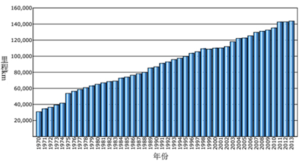 截至2013年,歐洲氣體管道事故數據組織(EGIG)管理的歐洲輸氣管網(wǎng)總長(cháng)度為143 727 km(圖10)。自1970年以來(lái),歷年管道事故數量呈下降趨勢(圖11)。