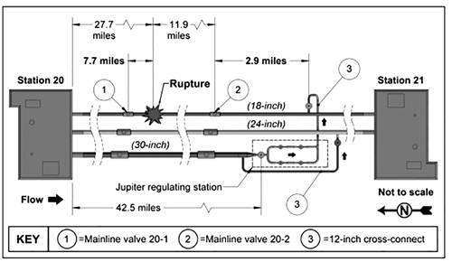 20#、21#壓氣站間共有3條管道,管道可以通過(guò)一條30英寸環(huán)線(xiàn)管道實(shí)現互通。事件發(fā)生時(shí), 30英寸管道正向100#管道注入天然氣。另外,破裂點(diǎn)上下游各有一個(gè)自動(dòng)關(guān)斷閥門(mén),分別為20-1# 及20-2# 。