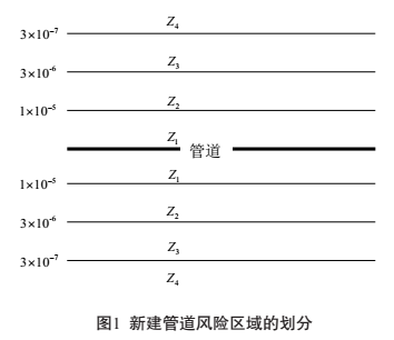 根據表1,可以將新建及在役管道劃分為四個(gè)風(fēng)險區域Z1、Z2、Z3、Z4,如圖1所示。在圖1中Z1區域,新建管道的個(gè)人風(fēng)險值IR≤1×10-5,在役管道的個(gè)人風(fēng)險值IR≤3×10-5。區域內人數應<30人,如果超過(guò),管道應改線(xiàn)或者將建筑物搬離。