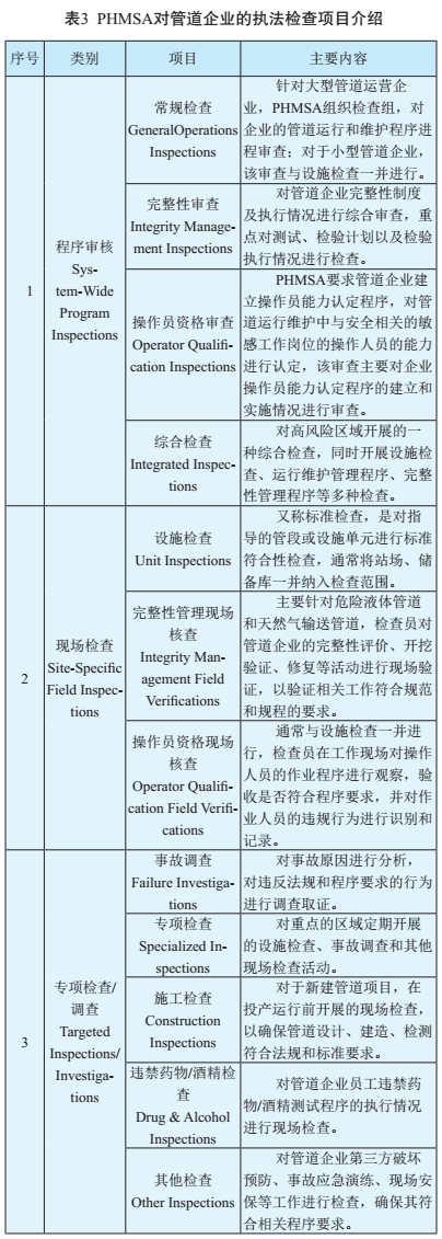 PHMSA對管道運營(yíng)企業(yè)的執法檢查分為:程序審核、現場(chǎng)檢查和專(zhuān)項檢查/調查等3類(lèi),各類(lèi)執法檢查的項目和主要內容見(jiàn)表3[7]。