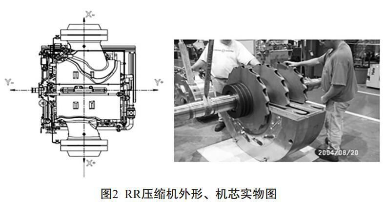 機殼為鑄造機殼,在機殼內鑄造有進(jìn)氣室和排氣室,分別與進(jìn)排氣法蘭連通,不需要在機芯上制作蝸殼,如圖2所示。壓縮機的進(jìn)出口法蘭中心線(xiàn)在同一條直線(xiàn)上,且都采用了36吋的接口。因此, RR壓縮機的機殼是統一的,機芯改型較為方便。