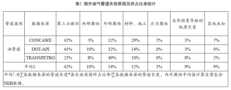 2006 年,中國石油開(kāi)始對管道實(shí)施完整性管理, 根據國內統計的管道失效數據,管道的主要失效原因依次為外力破壞、腐蝕、制造缺陷、自然災害、誤操作和其他原因,總體趨勢與國外EGIG 統計結果一致。