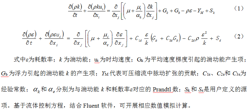 流體控制采用標準k-ε雙方程模型,標準k-ε模型自從被Launder和Spalding提出后,就變成工程流場(chǎng)計算中的主要工具,它是個(gè)半經(jīng)驗公式。標準k-ε雙方程模型假定湍動(dòng)粘度μi是各向同性的,其基本輸運方程為: