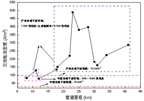 圖 1 管道沿線(xiàn)交流干擾電壓和交流電流密度分布