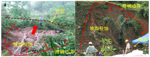 侵蝕型坡面泥石流發(fā)生在山坡坡面分布有較厚的土層和破碎風(fēng)化巖體的地區,其中施工期管溝回填覆土、棄土及管道施工擾動(dòng)松散土體是主要物源[8,9]。泥石流發(fā)生斜坡溝谷不發(fā)育,往往是新生溝谷。發(fā)生時(shí)間上跟降雨過(guò)程密切相關(guān),其出現的地區與暴雨中心在山區出現的位置基本一致。大暴雨時(shí)強地表漫流沖刷陡坡松散土體形成侵蝕型坡面泥石流。云南蒙自馬街坡面泥石流(圖1 a)和貴州都勻昌明坡面泥石流(圖1 b)即屬此種類(lèi)型。由于侵蝕型坡面泥石流多為槽形淺溝,一般情況下造成管道露管,排查時(shí)容易被誤認為坡面水土流失而忽視。其實(shí)不然,坡面泥石流的發(fā)生往往伴生著(zhù)淺層滑坡的發(fā)育,滑坡推力對管道安全造成威脅(圖4)。