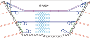 由于坡面泥石流具有先洪水后泥石流的特點(diǎn),一味地攔擋反而會(huì )抬升壩前靜水壓力。此時(shí)宜采取水石分離,暫時(shí)放先頭來(lái)水通過(guò),柔性網(wǎng)在受沖擊過(guò)程中吸收漂礫的絕大部分能量,達到消能、阻止或減緩泥石流啟動(dòng)的目的[12]。目前泥石流柔性防護系統已經(jīng)成熟,適用于流域寬度小于30 m的中小型泥石流溝治理(圖7~9)。