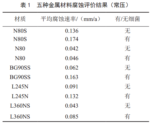 為進(jìn)一步明確N80S、 N80、 BG90SS、 L245N、L360NS五種金屬材料在頁(yè)巖氣返排液中的腐蝕狀況,根據JB/T 7901―1999《金屬材料實(shí)驗室均勻腐蝕全浸試驗方法》與SY/T 0532―2012《油田注入水細菌分析方法 絕跡稀釋法》,開(kāi)展現場(chǎng)返排液無(wú)菌/有菌環(huán)境中及常壓/高壓條件下的腐蝕評價(jià)實(shí)驗[3]。