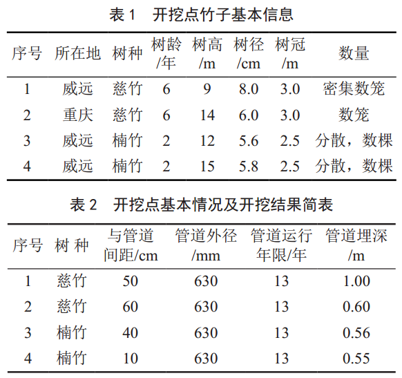 4處現場(chǎng)開(kāi)挖點(diǎn)的竹子基本信息和管道信息詳見(jiàn)表 1、表 2。