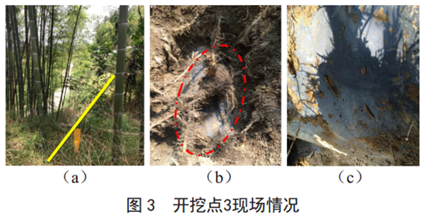(1)開(kāi)挖點(diǎn)3現場(chǎng)調查情況,F場(chǎng)開(kāi)挖后,發(fā)現管道上方有一殘留的竹樁,說(shuō)明之前管道正上方有一棵楠竹,見(jiàn)圖 3(a)。楠竹的地下莖部分(竹鞭)十分發(fā)達,延生距離遠,范圍廣,見(jiàn)圖 3(b),且大部分竹鞭都緊挨管道上表面。將管道上表面的竹鞭清除后,對防腐層進(jìn)行100%目測檢查,未發(fā)現防腐層破損或防腐層壓痕,見(jiàn)圖 3(c),此處楠竹根系暫未對三層PE防腐層造成破壞。