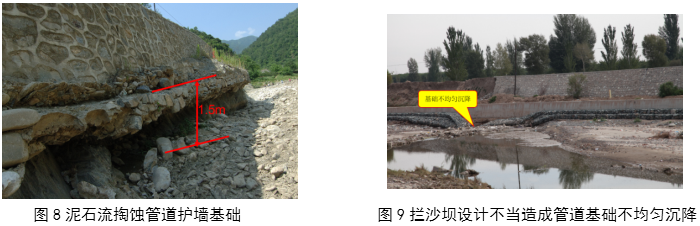 當管道和泥石流“伴行”時(shí),要考慮泥石流的側向侵蝕,因為泥石流沿彎曲溝道運動(dòng)時(shí)速度快、慣性大,在彎道凹岸處有顯著(zhù)的彎道超高現象。行進(jìn)中的泥石流若突然受陡壁阻擋,會(huì )在凹岸底部產(chǎn) 生強大的環(huán)流,對凹岸產(chǎn)生極大的破壞力(圖 8),攔沙壩設計不當造成管道基礎不均勻沉降(圖 9),所以,泥石流排導溝槽要增加防掏蝕和沖擊的措施。