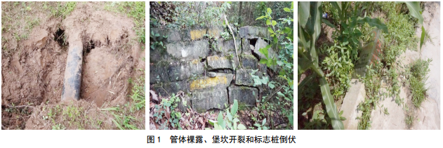 2015年10月,在普光氣田某輸氣管道宏觀(guān)檢查中,檢查水工保護設施928處,發(fā)現堡坎坍塌、開(kāi)裂及水土流失導致管體裸露共63處;檢查“三樁一牌” 648個(gè),倒伏、損壞10個(gè)(圖 1)。檢查情況及時(shí)反饋給相關(guān)管理部門(mén),坍塌、開(kāi)裂的堡坎已修復,裸露管段已填埋,倒伏的“三樁一牌”已扶正加固,同時(shí)巡檢方加強了穿跨越段和易沖刷部位的巡檢頻率,并做好巡回檢查記錄。