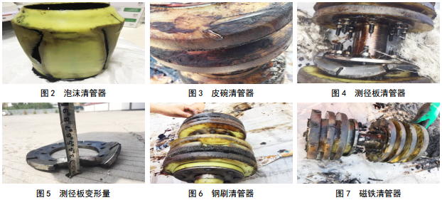 根據內檢測計劃,2017年9月5日至2018年8月8日,先后對該管段發(fā)送泡沫、皮碗、測徑板、鋼刷、磁鐵清管器各一次及模擬體兩次,均順利收球(圖 2-7),清出污物較多(鐵條13根),但清管器密封板均有劃痕,測徑板均出現變形。