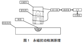 如圖 1所示,由線(xiàn)圈和永磁體構成的永磁擾動(dòng)探頭勻速掃查待檢測鐵磁金屬表面,遇到金屬表面不連續就會(huì )在線(xiàn)圈上產(chǎn)生電壓突變,該電壓突變隨后經(jīng)過(guò)放大、濾波及A/D轉換進(jìn)入計算機數據處理系統。