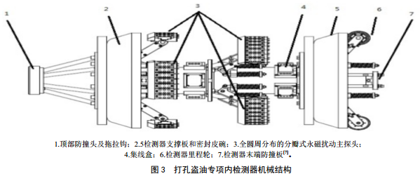 檢測器主體結構包括防撞頭、支撐板、密封皮碗、永磁擾動(dòng)探頭、里程輪、航空插頭及集線(xiàn)盒等,如圖 3所示。